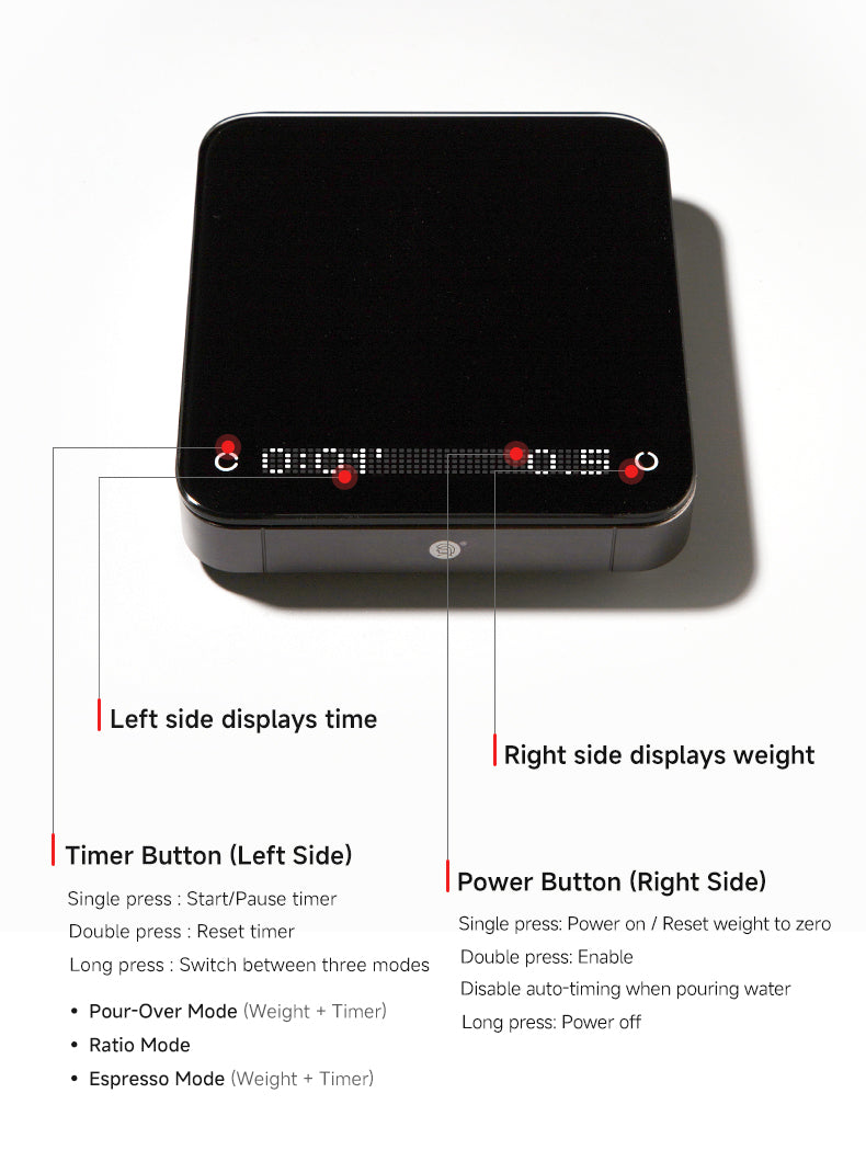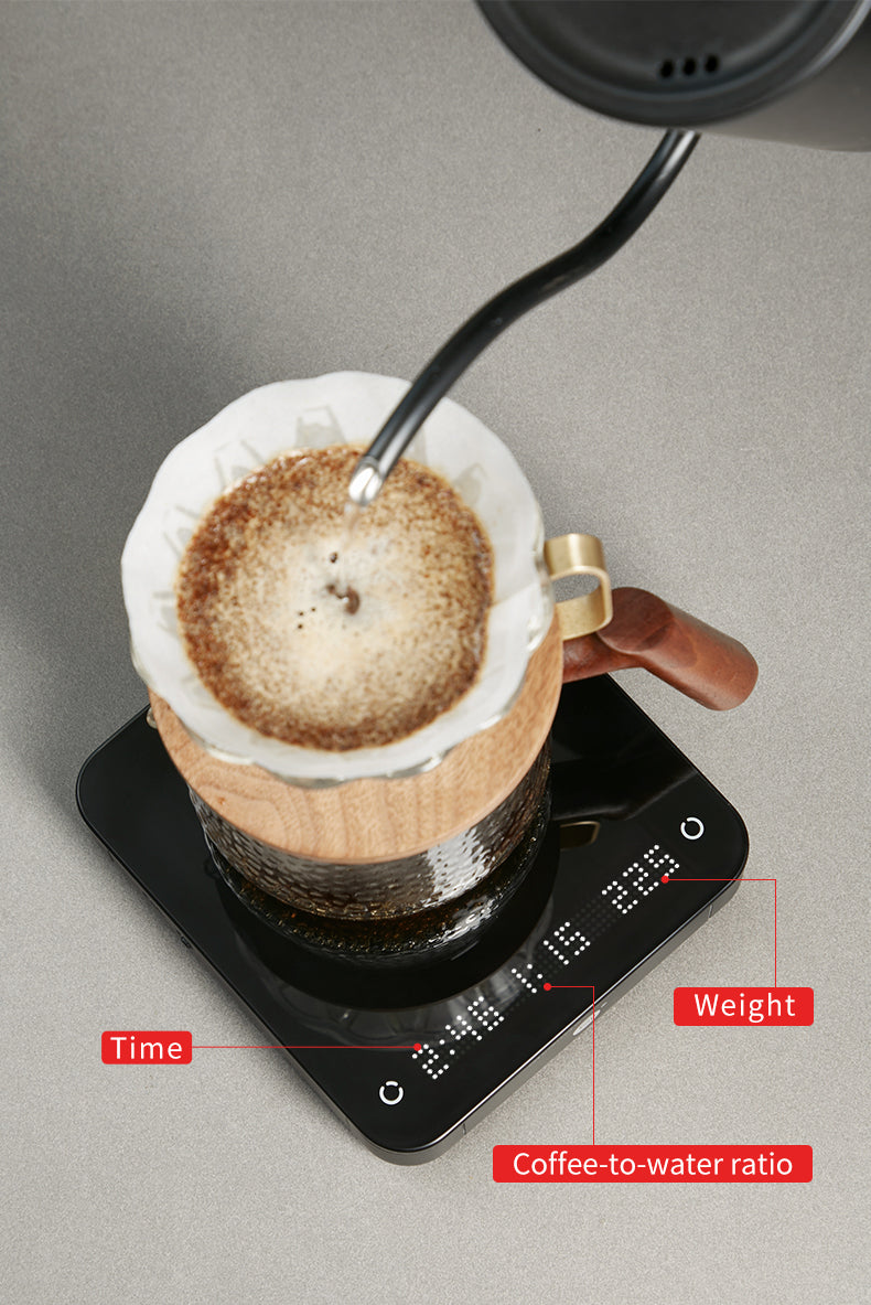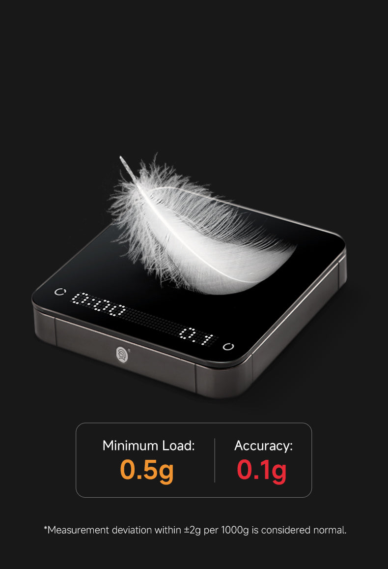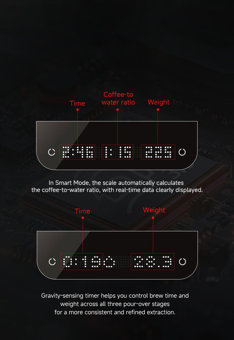A balança apresenta um modo de prática de controle de fluxo, permitindo que os usuários melhorem sua técnica de preparo rastreando visualmente o fluxo de água em tempo real. O guia de preparo integrado ajuda os iniciantes a dominar rapidamente as técnicas de preparo manual com instruções passo a passo e feedback gráfico. -
