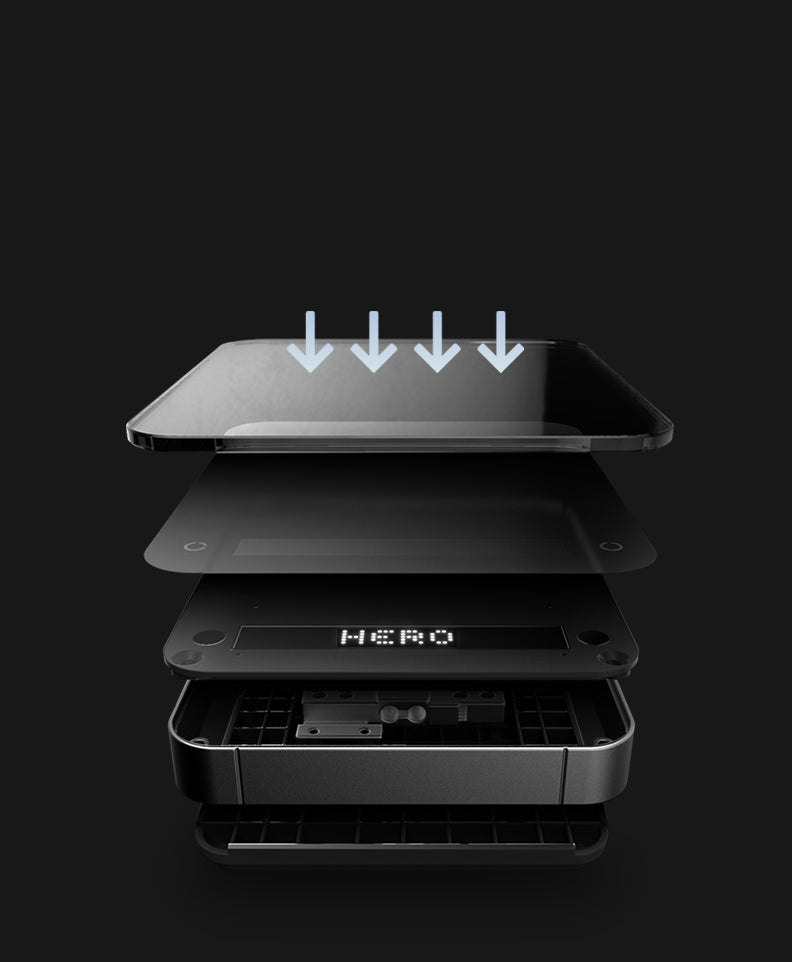 Com um conjunto aprimorado de quatro chips principais e sensores de alta precisão, a balança zeroHero fornece medições rápidas e precisas. A superfície de pesagem de vidro temperado espelhado é resistente ao calor, enquanto a almofada de isolamento de silicone espessada fornece proteção adicional contra altas temperaturas, garantindo durabilidade a longo prazo. -